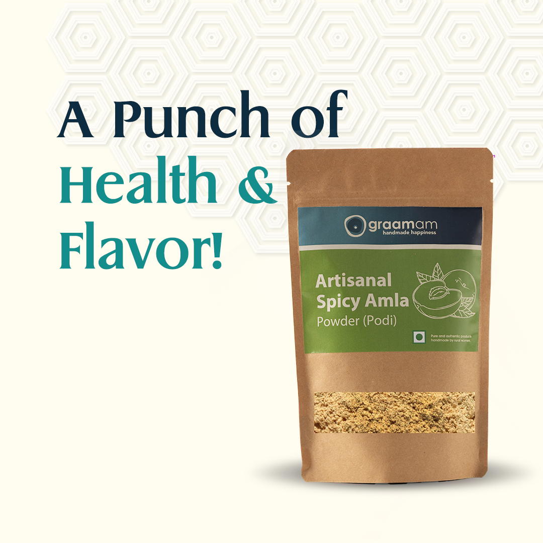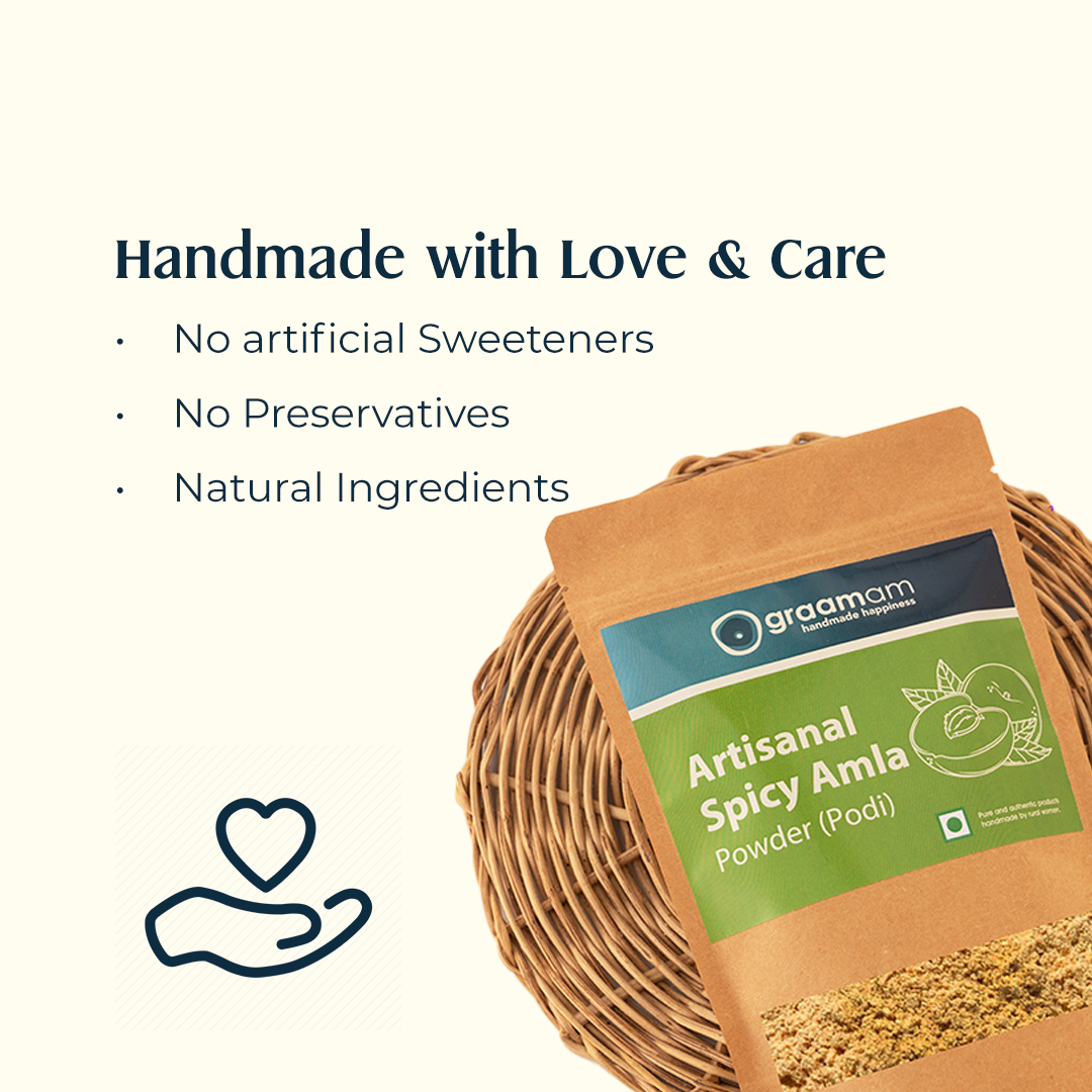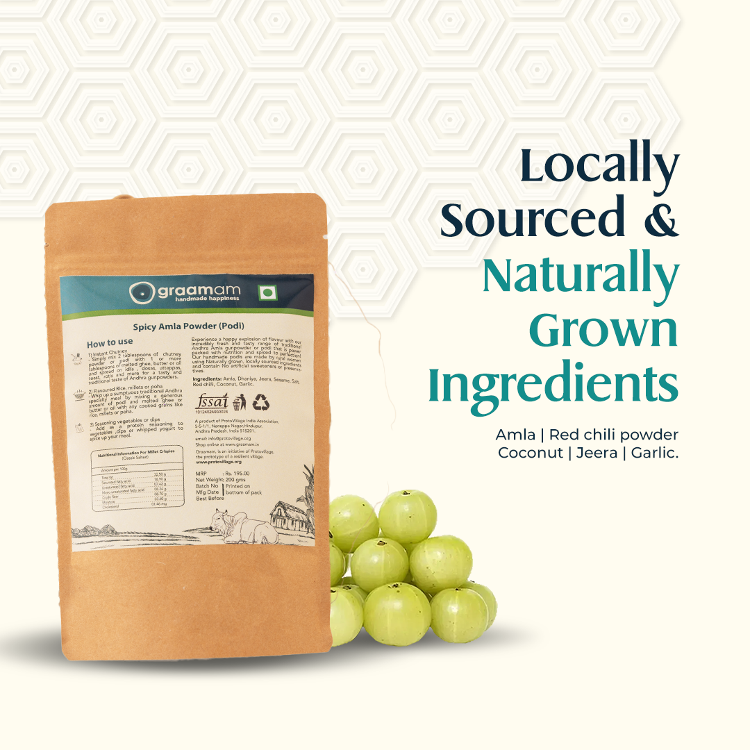 Explore the tangy zest of our Amla Podi, meticulously handcrafted by rural women using traditional methods. It is a testament to the skill and dedication of the artisans who prepare it. It's an excellent choice for enhancing everyday meals with a touch of tradition and a burst of healthful benefits, all without any preservatives or artificial sweeteners.