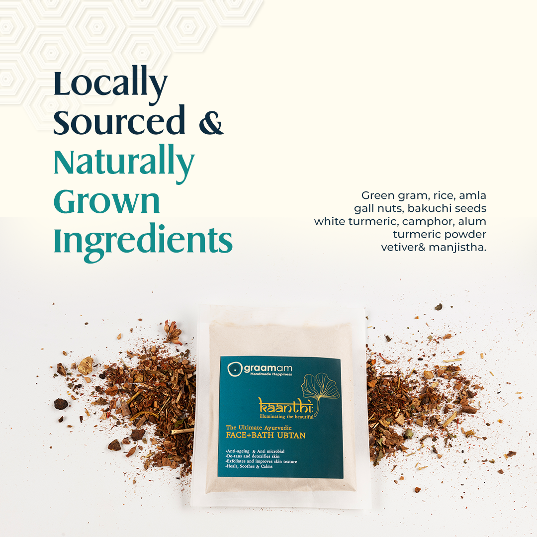 Experience the benefits of Graamam's Ayurvedic Face and Body Ubtan- a blend of traditional ingredients crafted to rejuvenate and nourish your skin. Enriched with green gram, rice, amla, gall nuts, bakuchi seeds, white turmeric, camphor, alum, turmeric powder, vetiver, and manjistha, this gentle yet effective ubtan offers gentle exfoliation, antioxidant protection, soothing cleansing, and overall skin rejuvenation. Pamper yourself with this holistic Ayurvedic formulation for a radiant complexion and a revitalized body.