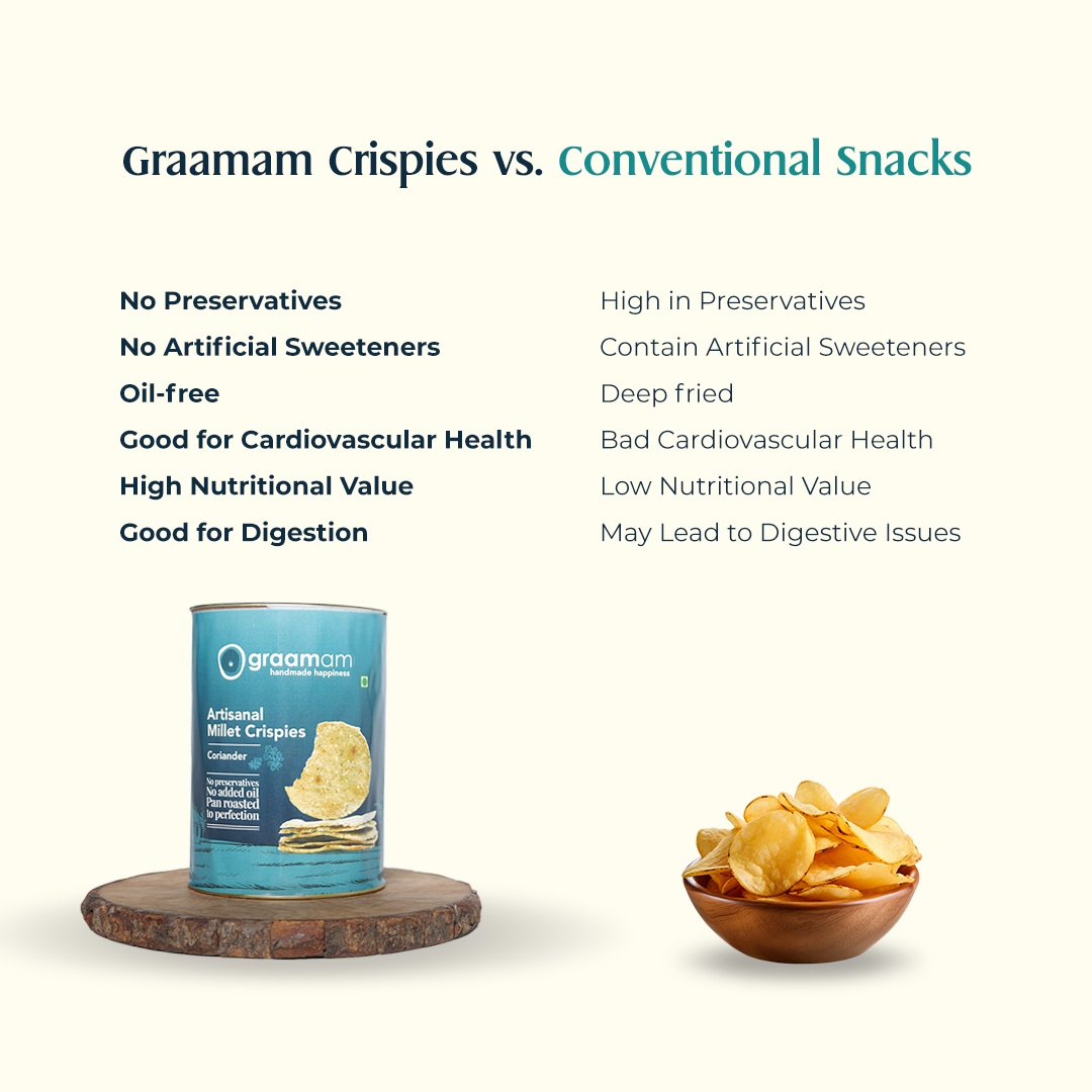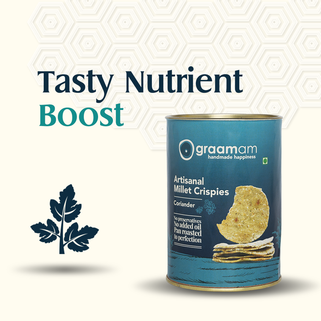 Coriander Crispies offer the goodness of Bajra, Nuts, and Seeds combined with the aromatic flavor of coriander. These are India’s first zero-oil pan-roasted Crispies that bring a tasty, healthy twist to your snacking habits. Made with traditional methods these crispies bring the love and taste of rural India to you.