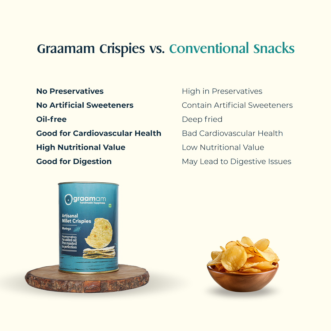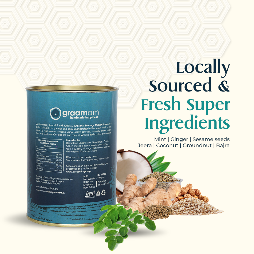 Experience the goodness of locally sourced Moringa combined with Bajra, Nuts, and Seeds in our Moringa Crispies. Hand-processed, pan-roasted with care, and oil-free, each crispy dish is made with love and dedication. Infused with the rich flavors of Moringa leaf powder, these crispies offer a unique taste that celebrates the earthy essence of rural India. Enjoy a wholesome snacking experience that nourishes both body and soul, free from artificial additives or preservatives.